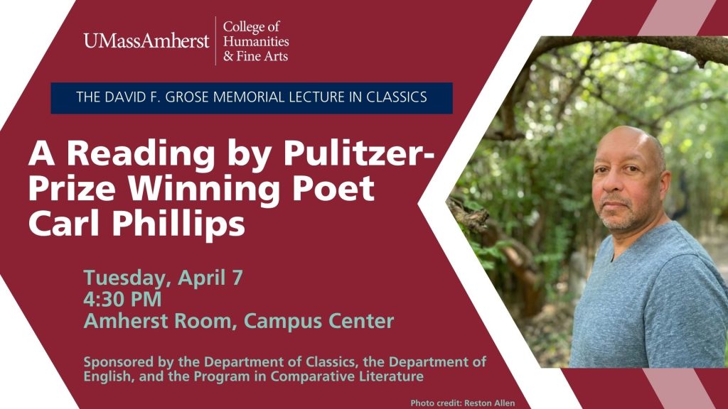 The UMass Amherst Department of Classics invites CANE members to join in remotely for a lecture by the renowned poet, Carl Phillips. As our 2026 David Grose Memorial Lecturer, Professor Phillips will share his work and reflections on a fascinating career. He is the author of 17 books of poetry and received the Pulitzer Prize in 2023 for his book, Then the War: And Selected Poems 2007-2020. He has won many other poetry awards as well and his poems are frequently featured in the Best American Poetry series that appears annually. Aspects of the ancient world are frequently featured in his poems (such as this poem). In 2003 he published a translation of Sophocles’ Philoctetes for OUP.